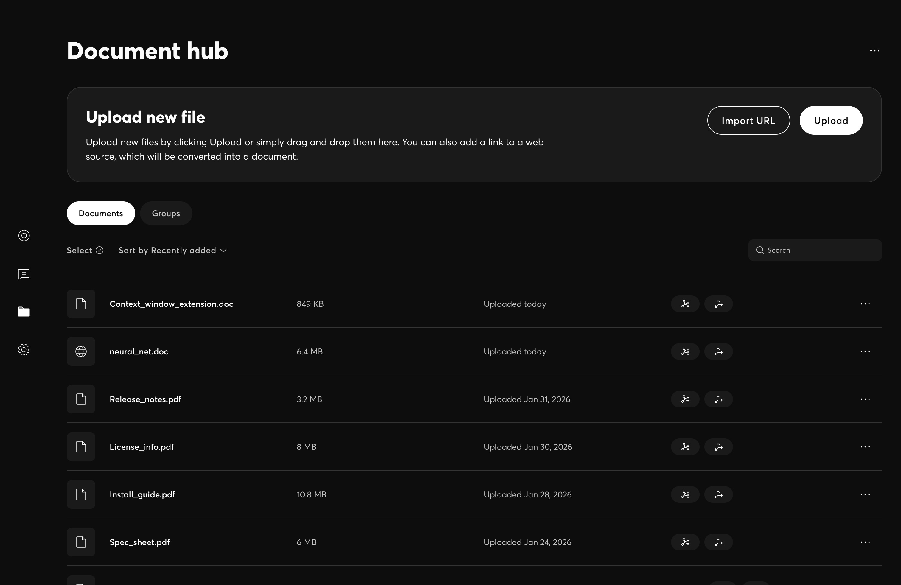 The Document Hub serves as a central foundation where information is organized, categorized, and refined. Users can seamlessly integrate diverse documents and web links to power their conversations across the platform.