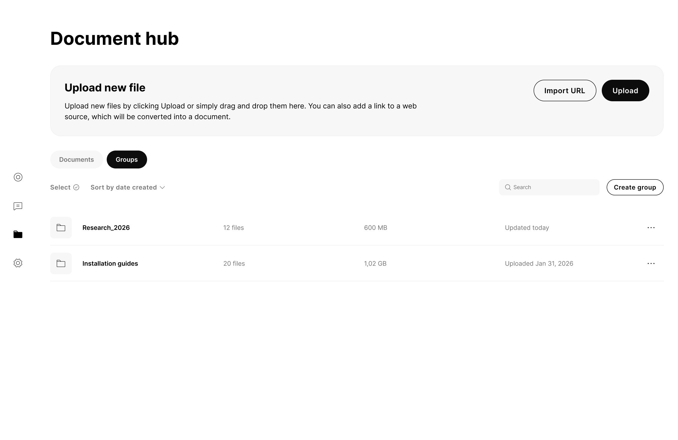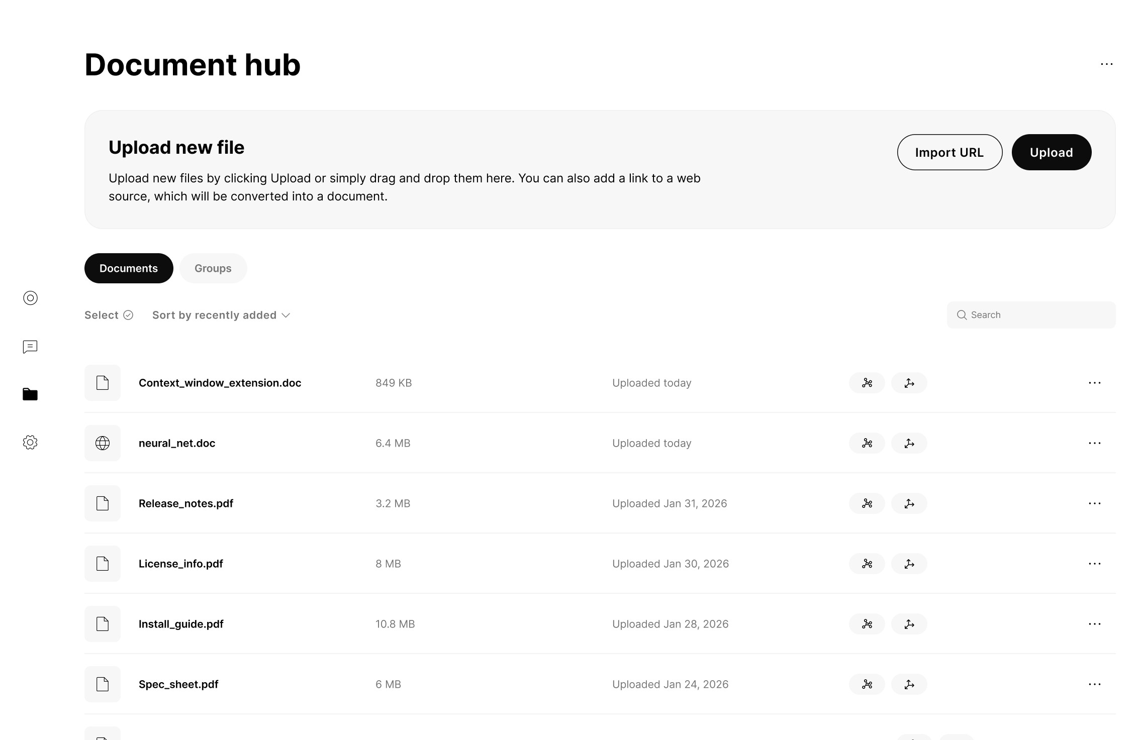 The Document Hub is a core feature that serves as the foundation where information is organized, categorized, and refined. Users can seamlessly integrate diverse documents and web links to power their conversations across the platform.