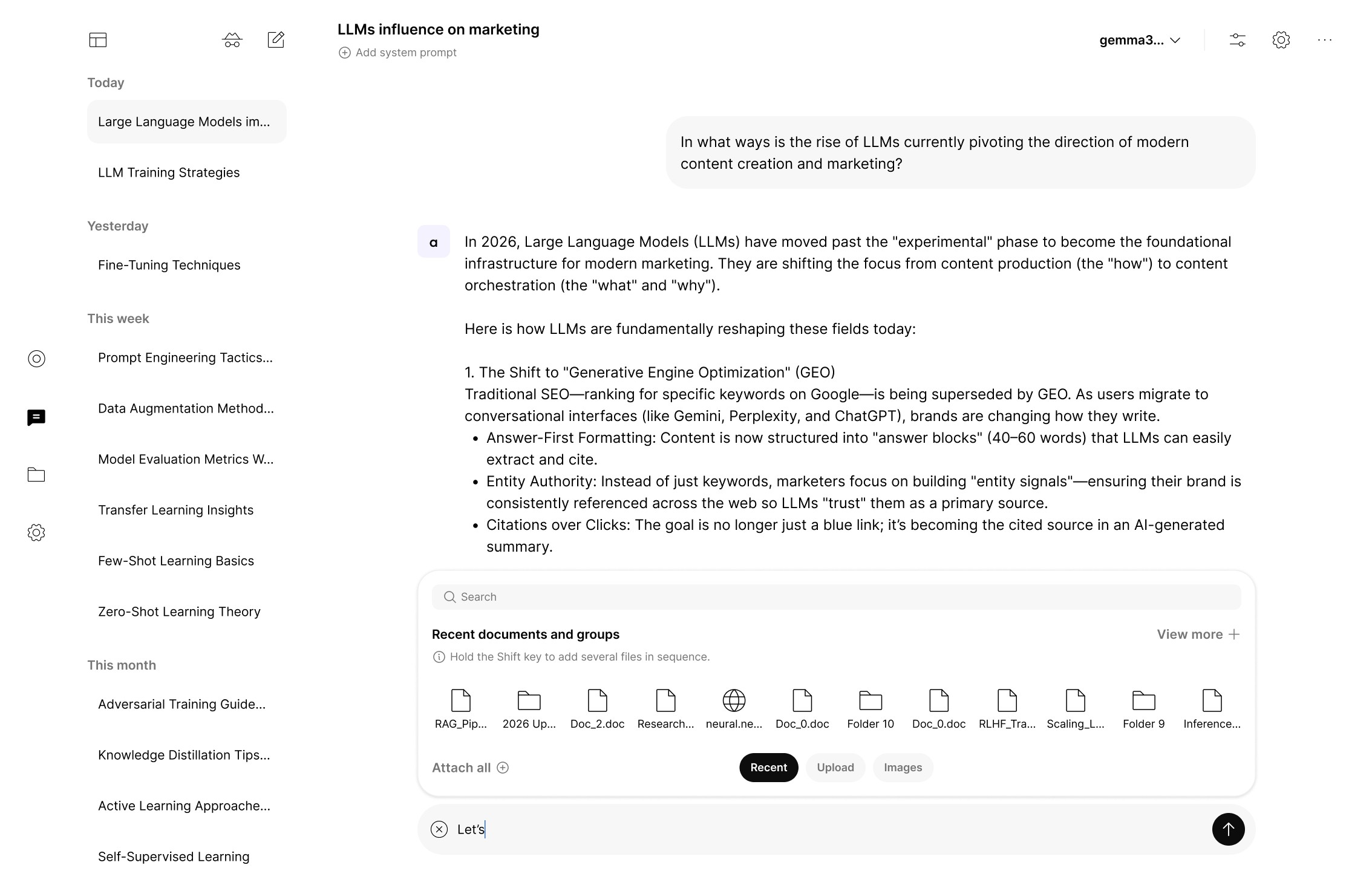 Through the RAG experience, users can transform selected documents into their ideal workflow using custom system prompts and pinned context features.